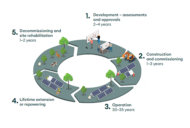 A solar farm consists of a large-scale solar photovoltaic (PV) generation facility, and associated infrastructure. It comprises the installation of solar PV panels, substation, inverters, power cabling, site offices and access tracks. A transmission line to connect the solar farm to existing electrical infrastructure may be required.